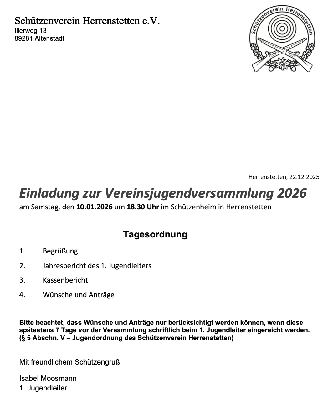 Einladung zur Jugend- bzw. Generalversammlung am 10.01.2026